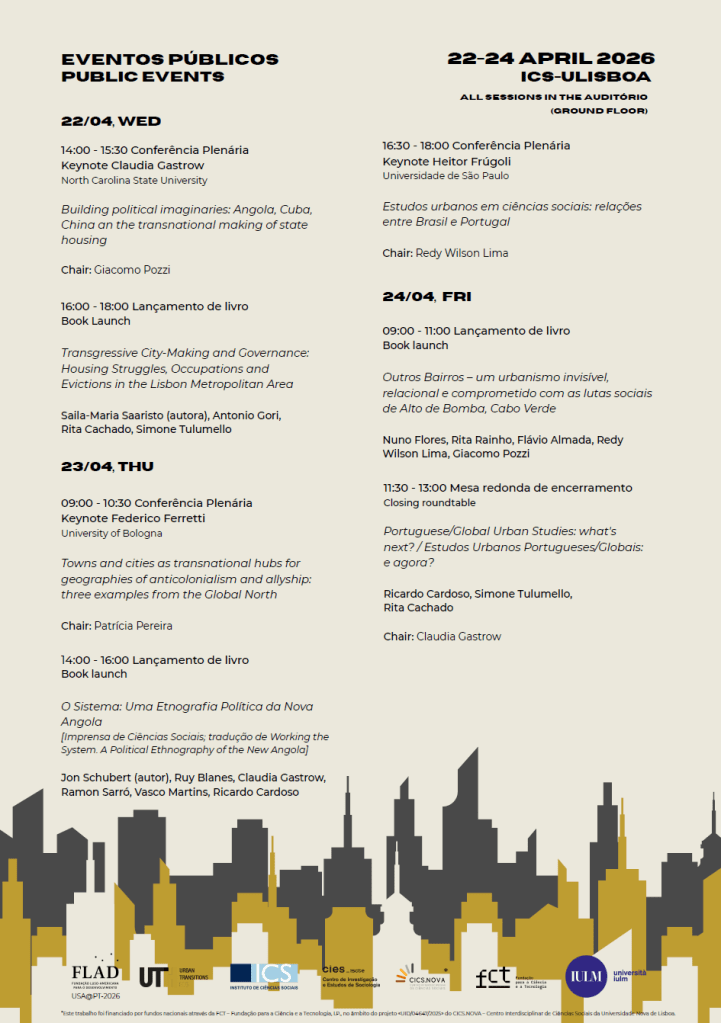 11:30-13:00 Closing roundtable – Portuguese/Global Urban Studies: what’s next? / Estudos Urbanos Portugueses/Globais: e agora? with Ricardo Cardoso, Simone Tulumello, Rita Cachado (moderação chair: Claudia Gastrow)